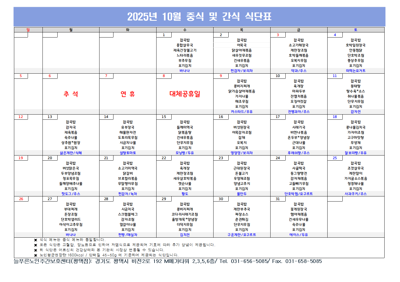 10월 식단표(평택점)