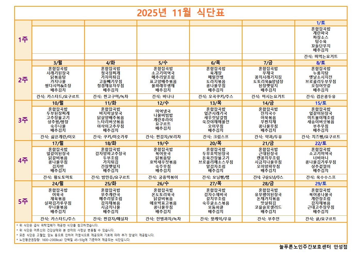 11월 식단표(안성점)