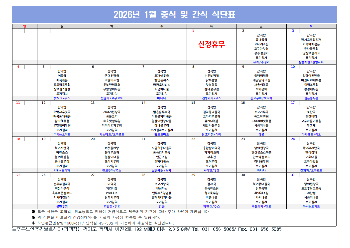 2026 1월 식단표 (평택점)