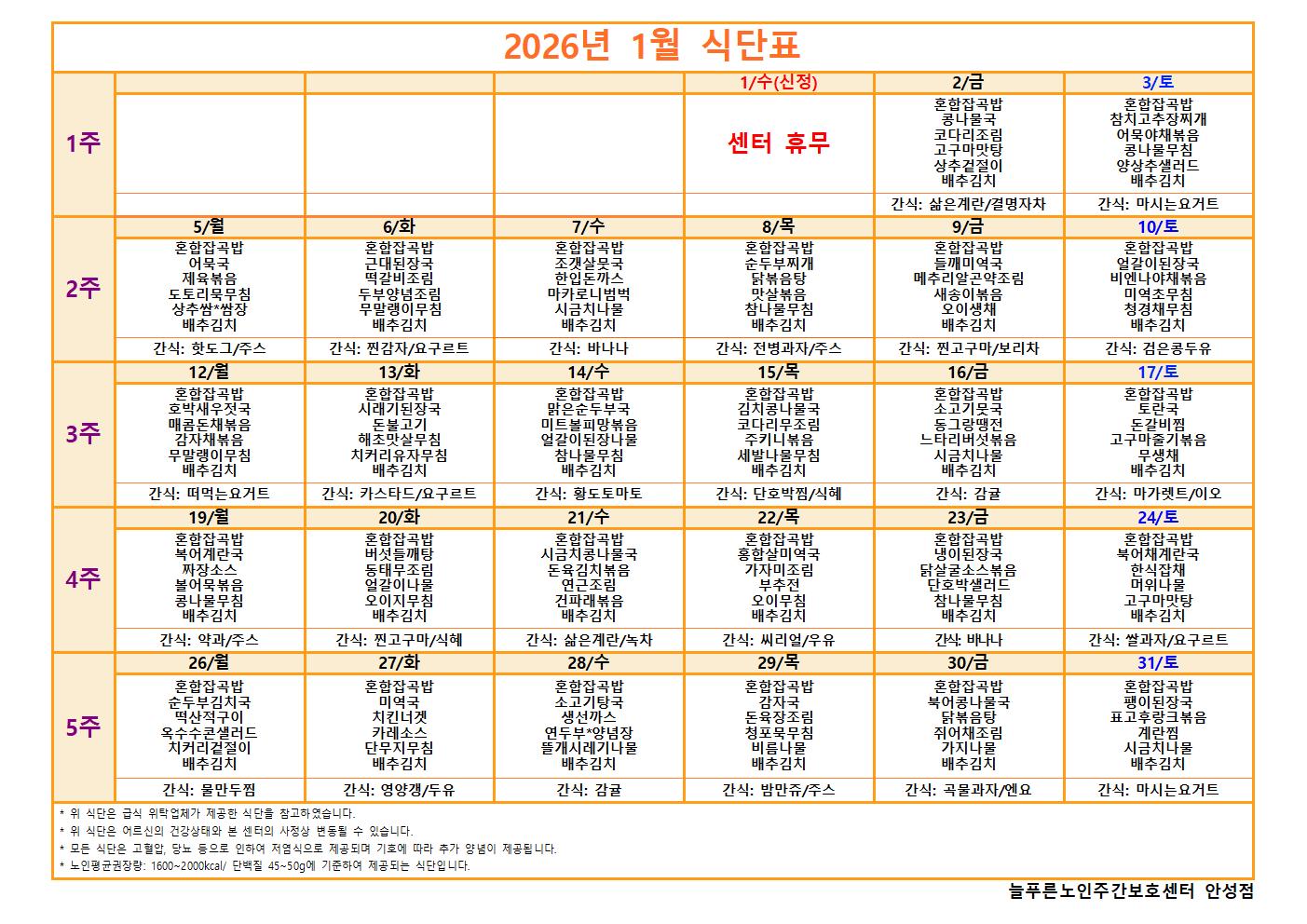 2026 1월 식단표 (안성점)
