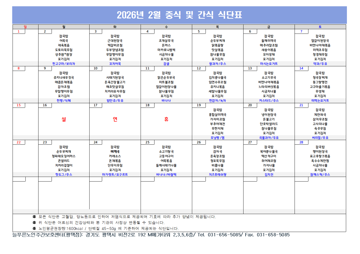 2026년 2월 식단표(평택점)